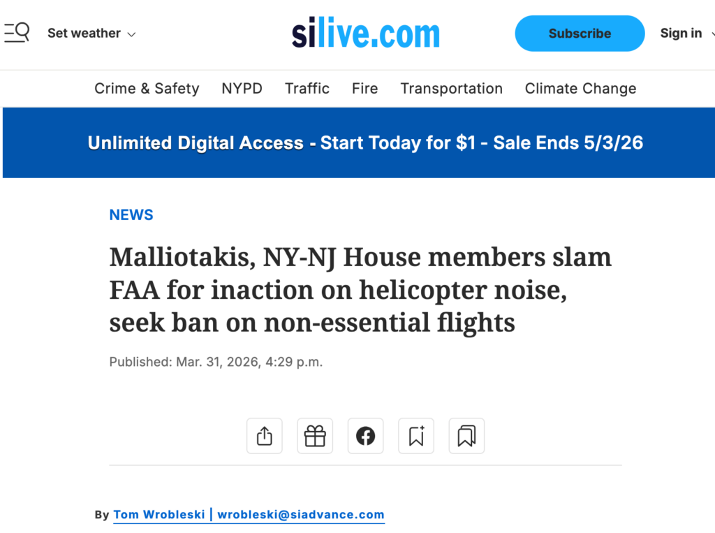 March 31, 2026- A bi-partisan group of federal lawmakers from New York and New Jersey has slammed the Federal Aviation Administration for failing to act to curb nuisance helicopter noise over the region. The lawmakers, including Rep. Nicole Malliotakis , also pitched a raft of new laws aimed at eliminating the noise menace. Read more